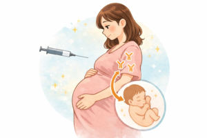 特に生後1〜2か月は入院リスクが高く、基礎疾患のない赤ちゃんでも重症化することがあります。アブリスボ®は、妊娠中に接種することで胎盤を通じて抗体を移行させ、出生直後から赤ちゃんを守ることができるワクチンです。